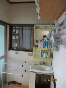 築30年ぐらいのよくあるタイル出仕上げた浴室に底が痛んでしまった洗面化粧台。